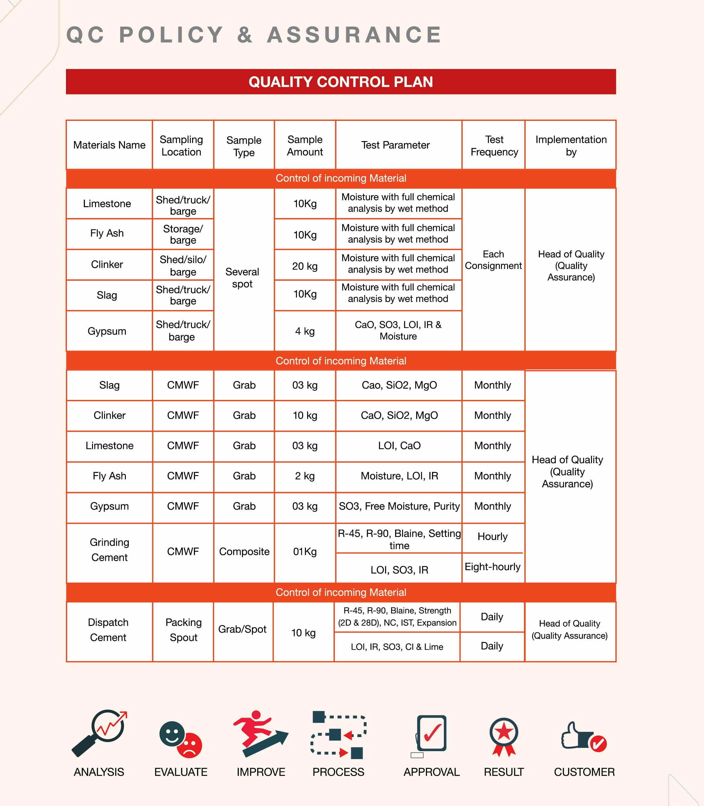Quality Assurance System Quality plan of Quality Assurance Department is divided into three process flow: Raw Materials Quality Control Production Process Control & Sampling Finished Products. Raw Materials Quality Control Physical Test: Temperature test of Clinker, Lime, Slag, Fly Ash, Gypsum etc. Clinker Moisture, Size, Bulk Density Test Fineness Test: Clinker Grinding by mini Ball Mill Setting Time Test Compressive Strength Test.
